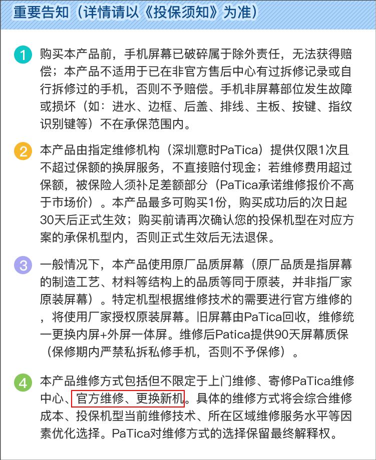 在这款产品的宣传页面上,近日还发布了“PaTica手机碎屏险(新春版)”服务升级海报,宣传内容出现“本产品维修方式包括但不限定于上门维修、寄修PaTica维修,、官方维修、更换新机。”等字眼。其中,“官方维修、更换新机”字眼,出现在投保须知中。这也就意味着支付宝碎屏险的维修方式已从上门维修及寄修两种方式扩充至上门维修、寄修、官方维修和以换代修四种方式。