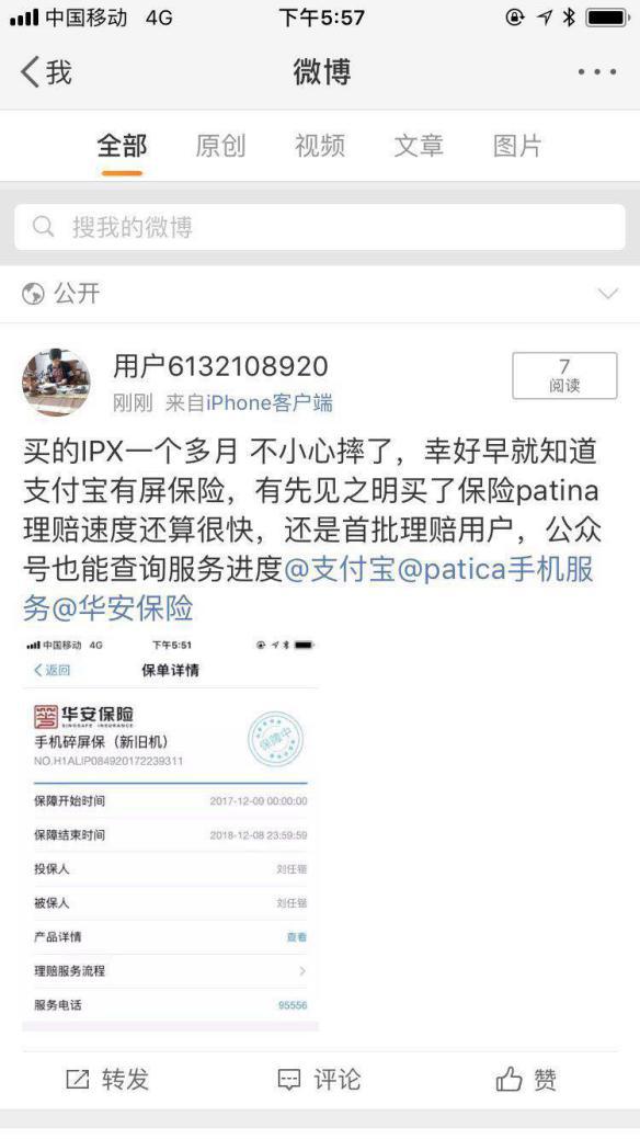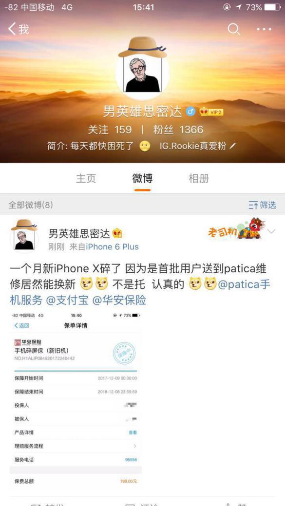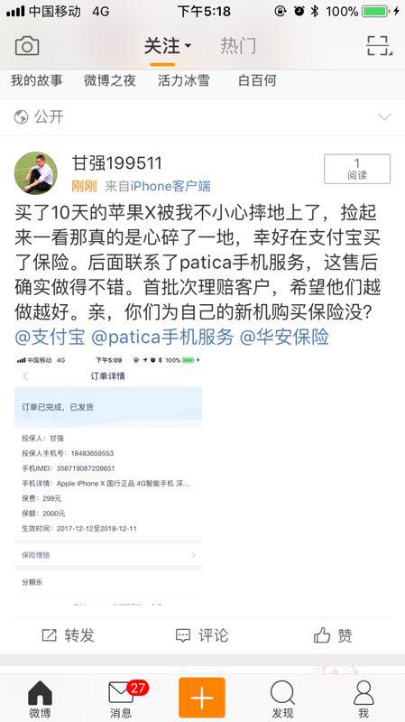 承接这一产品维修服务的,合作维修商深圳意时Patica表示, “支付宝碎屏险产品在市场变化中获得广大客户认可,为更好服务消费者,该产品的保障内容更是逐步升级。此次推出官修及以换代修的增值服务是基于完善用户体验的角度出发,在常见的维修方式基础上,增加官方维修和以换代修,更能给到客户更多选择与保障,目前已有数百名用户享受到了iPhone X以换代修服务。当然,目前以换代修的服务也,iPhone X机型专享,其他机型的产品售后服务正在持续优化中。” 近期获得以换代修机会的支付宝iPhoneX碎屏险用户也纷纷在微博晒出照片。