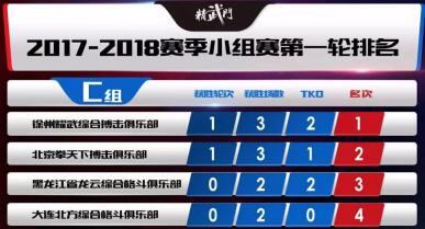 2018年1月20日、21日,精武门综合格斗职业联赛(2017—2018赛季)团体小组赛第二轮在合肥市安徽省体育馆开打,国内16家,俱乐部分为四组,捉对厮杀,争夺小组出线权,上演霸都血战。在首轮比赛中,拳天下CTT、北京格斗兄弟、TB格斗、北京自由人、鑫度武术、耀武搏击、鑫江搏击、宁广友俱乐部八家俱乐部拿到小组,位置,但面对黑龙江龙云格斗、上海龙武士等俱乐部等实力派团队的“绝地反击”,谁能最终出线依旧是个悬念。