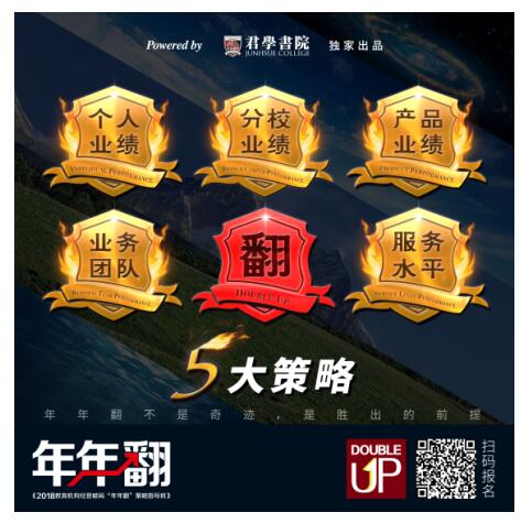 3月27日至29日,君学书院《2018教育机构经营破局“年年翻”策略指导班》将在上海正式举办,本期“年年翻”将聚焦教育机构营收翻翻五大策略,即个人业绩、分销业绩、产品业绩、业务团队和服务水平,助力机构实现100%高速发展。