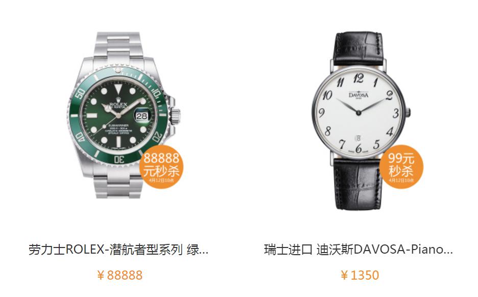 手表秒杀是每年手表节消费者最期待的环节,今年的名表限时秒杀活动在4月12日当天举行,有 10:00、15:00、20:00三个秒杀场次,迪沃斯、雅克利曼、天梭等名表秒杀,低至99元。