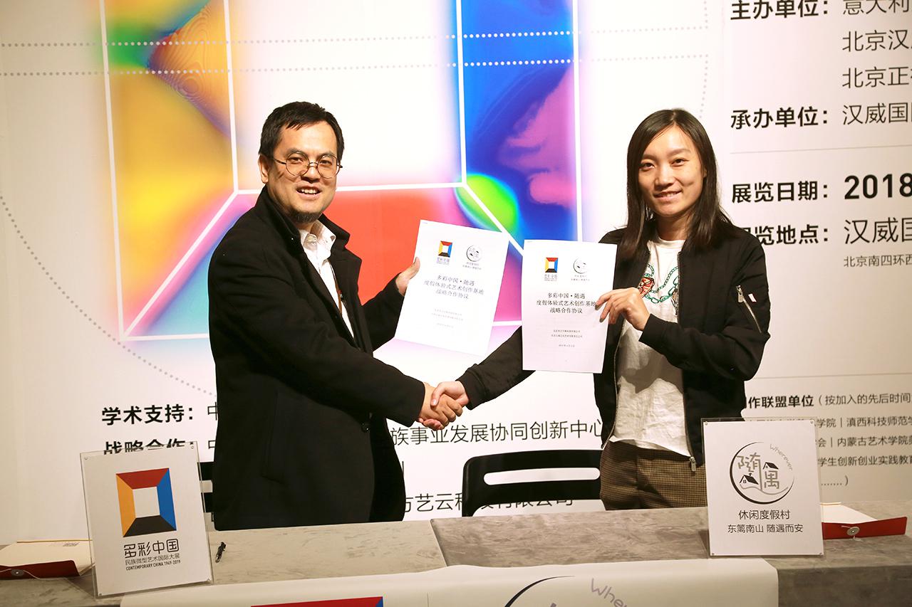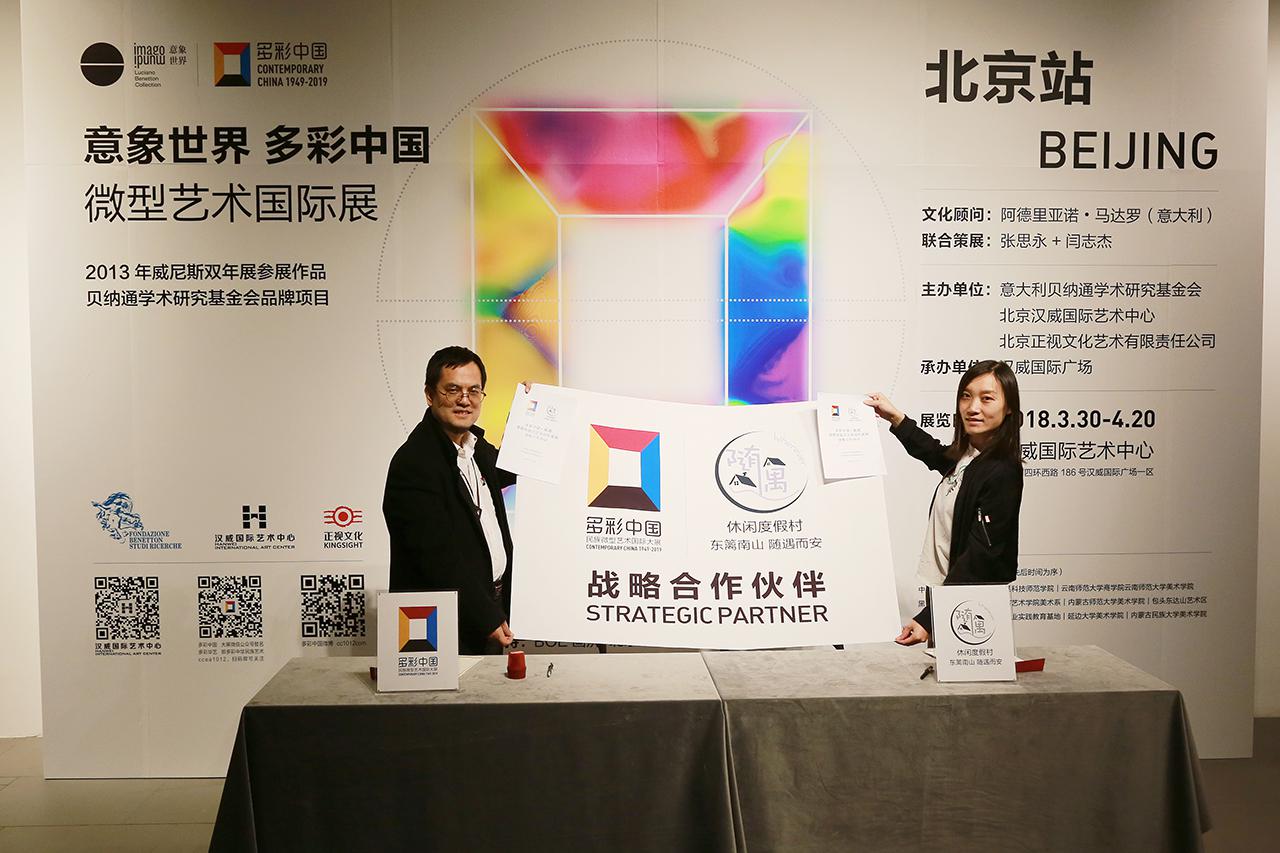 2018年4月3日,在北京汉威国际艺术,“意象世界 多彩中国——微型艺术国际展”现场,“多彩中国——民族微型艺术国际大展”中方总发起人、北京正视文化艺术有限责任公司总经理闫志杰,与中国知名的休闲度假村运营方北京东方百林科技有限公司旗下“随遇”品牌创始人滕晨,共同签署战略合作协议。