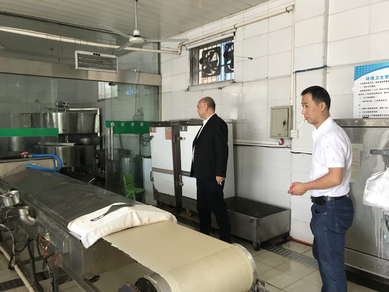 “改用生产线后,效率提高了不少,人也轻松了。”俞勇指着厂房内一台台形状各异的机器介绍说,“这是洗面机,将醒好的面团直接倒入即可自动‘洗’出面浆;这是自动温控凉皮熟制成型机,面浆经过这个机器蒸熟定型后,一张凉皮就制作成功了。”一条生产线日产凉皮大约为500张左右,是手工生产效率的10倍,而经过这几年的发展,俞勇的厂房内已经拥有了4台这样的凉皮生产线。