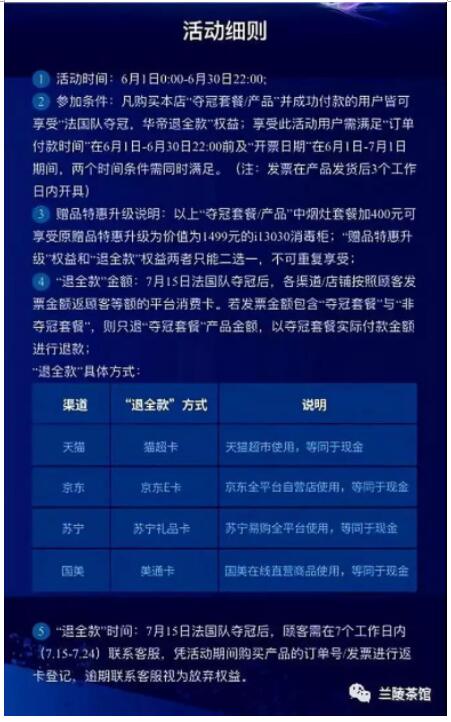 虽然小编总是被欺负姿势水平不高,但是这个规定简直可以说是清晰易懂至极了:先买,再发货,再收到发票,,退全款的时候以发票为准。 其实仔细想想华帝的这一做法也无可厚非,说到底就是怕消费者钻天猫、京东、苏宁上“7天无理由退款”的空子呗。法国夺冠了就提醒发货然后退全款,法国没夺冠就直接申请无理由退款,多么明显的一个无风险套利的机会啊!想一想小编也有点心动了!但厂家也不是傻子......在活动筹划时华帝就制订了活动规则杜绝了该情况的发生,未雨绸缪,简直高明。