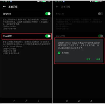 这里我们以王者荣耀为例介绍一下,我们可以看到当前支持的功能有“游戏灯效”和“Shark时刻”,我们选择打开「Shark时刻」,此时会弹出一个提示框,提示开启“shark时刻”会在后台进行录屏操作,由于记录游戏精彩瞬间是以视频形式,因此这个录屏的动作不可或缺,确认即可。
