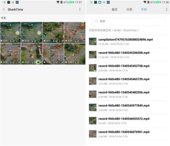对于保存与分享方面,当「Shark时刻」弹出后,每个视频下面会有两个小按钮,分别是「保存」和「云端分享」。点击保存按钮,那么会直接保存到/sdcard/DCIM/SharkTime目录,可以通过手机内置的“图库”或者“文件管理”进行查看。