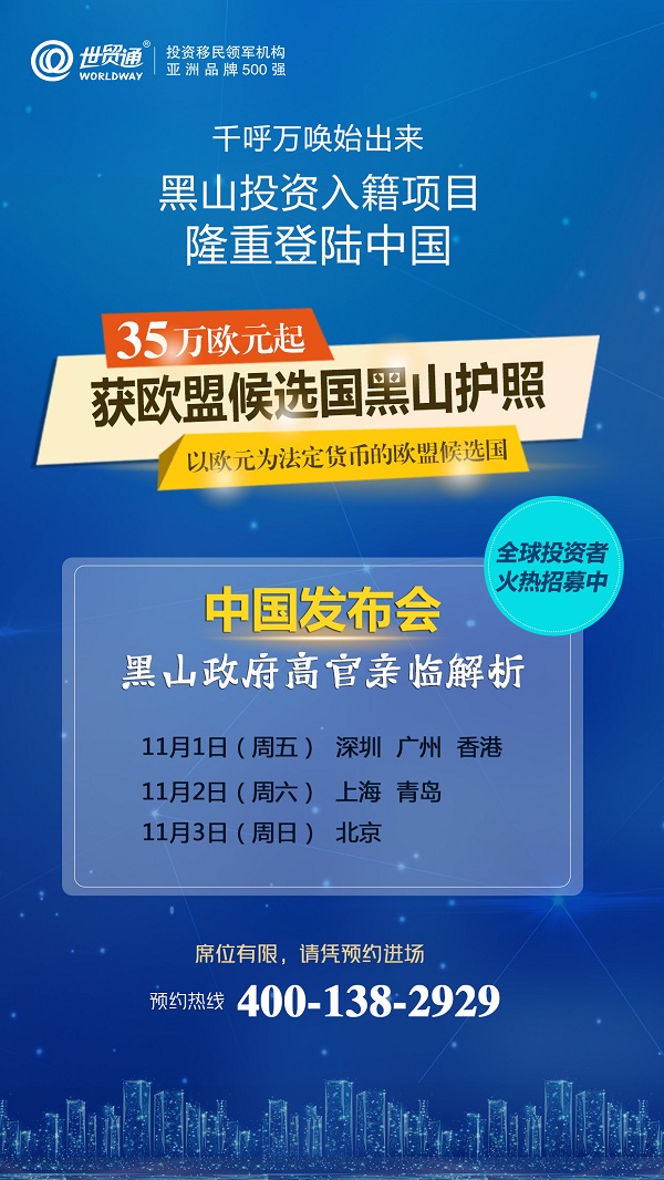 千呼万唤始出来,备受关注的黑山投资入籍项目隆重登陆中国,全球投资者火热招募中!世贸通携手黑山政府,将于11月1日-3日在中国深圳、广州、香港、上海、青岛、北京,举办黑山投资入籍项目登陆中国发布会!届时,黑山政府高官将亲临现场,为您多方面介绍黑山及黑山投资入籍政策,机会难得,席位紧俏,请抓紧时间预约!