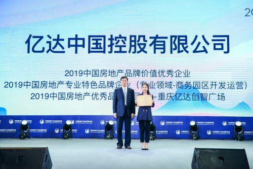 在优秀品牌企业表彰大会上,亿达中国荣膺“2019中国房地产专业特色品牌企业——商务园区开发运营”、“2019中国房地产企业品牌价值百强”,重庆亿达创智广场作为13个获奖项目中,的产业园区项目荣膺“2019中国房地产优秀品牌项目”。
