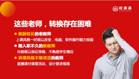 一些老教师在电脑、软件的操作能力方面也相对较弱,直播的时候或者直播前出现问题,一时不知道怎么去处理,比如很多老师会说,做了这么多年的老师,一直是用粉笔上课,突然线上上课时我需要做ppt动画了,这个时候比较痛苦,尤其是机构里面一些兼职的公立学校教师。