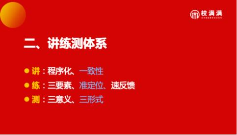 在K12板块运用得非常广泛,那么什么叫“讲练测”体系呢?这其实涉及到了我们教师培训的授课内容。