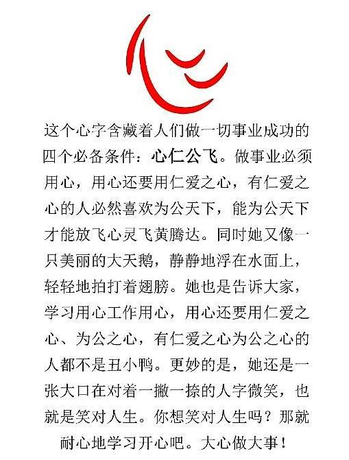 在开心文化的理论体系中,李元创造性地提出了一些概念,比如,“心力”,简言之就是一个人的涵养、素养、修养的集中表现,也是一个人毅力、恒心、决心、耐心、品德的综合显现。创造的“心”字开心标识凝聚了中华文化的精髓。一个“一体四字”的象形字,个中蕴藏人生成功必备的四个基本条件:“心、仁、公、飞”——做事要用心,工作要用心,学习要用心,用心还要用仁爱之心,有仁爱之心的人必然喜欢为公天下,能为公天下才能真正地放飞心灵。