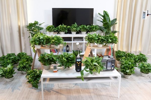 中国家电研究院的此次测评并没有在通常的实验室环境下进行,而是模拟了真实的家居环境,力求与消费者实际使用状况保持一致,在15㎡的空间内,摆放了24盆绿萝,现场俨然成为一个小型植物园。(注:室内初始温度约为28℃,湿度约46%,在均匀污染12小时后,甲醛初始浓度0.16mg/m3,在保持室内甲醛持续释放的前提下,进行数据采样记录。)
