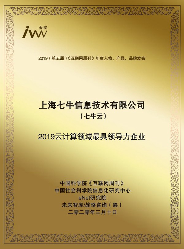 从美通社获知,近日,由中国科学院《互联网周刊》、中国社会科学院信息化研究,、eNet研究院、未来智库/战略咨询(筹)共同主办的2019《互联网周刊》年度人物、产品、品牌评选和颁布活动(第五届),,以全媒体矩阵的形式发布。经过数轮评审,七牛云凭借在云计算领域,的技术创新和商业模式,荣获“2019云计算领域,领导力企业”。