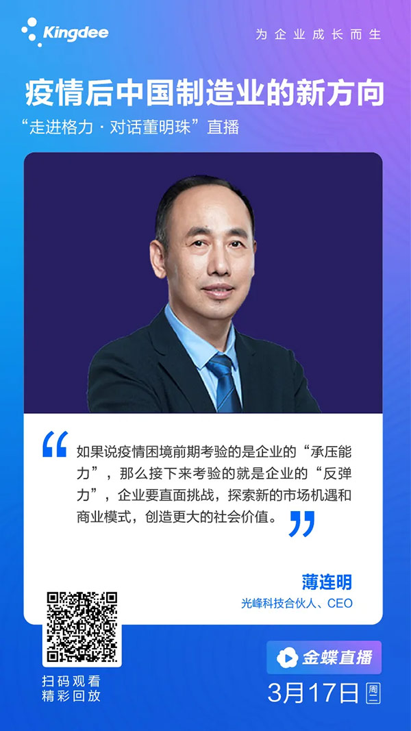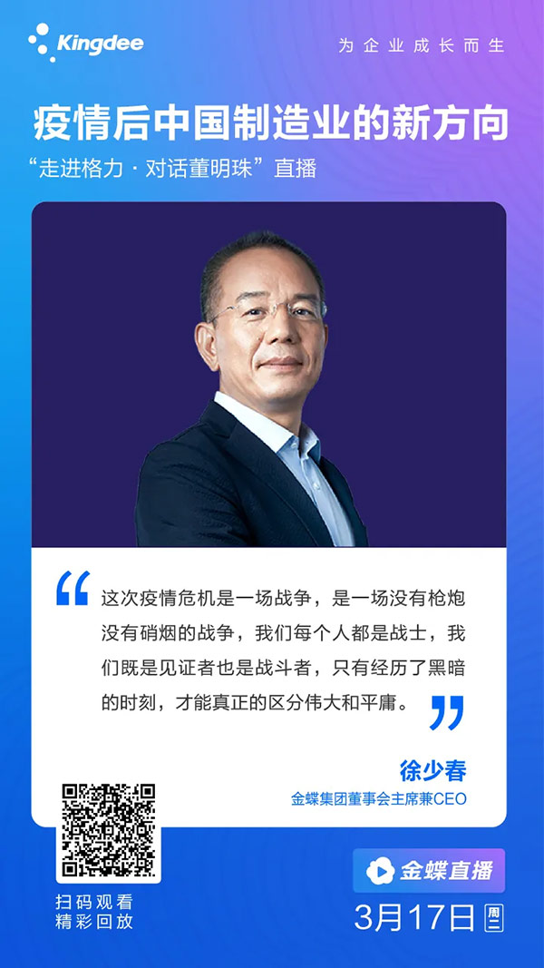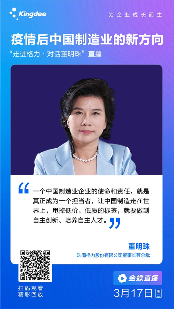 “以客户为,,以奋斗者为本,危机一定能战胜。”3月17日,格力电器董事长董明珠、金蝶集团董事会主席徐少春、光峰科技CEO薄连明、柔宇科技董事长刘自鸿相聚珠海格力总部,以公益直播的形式,共同探讨“疫情后中国制造业的新方向”。