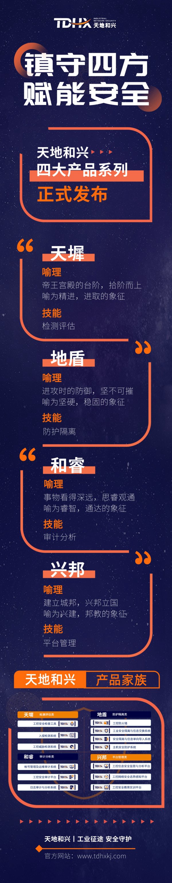 从美通社获知,天地和兴工控安全产品家族四大产品系列 -- “天墀”、“地盾”、“和睿”、“兴邦”正式发布。四大系列品牌以信息安全为驱动力,持续为用户提供安全检测评估类、安全防护隔离类、安全审计分析类、安全平台管理类等全方位的工控安全产品、服务和全生命周期的工控安全解决方案。