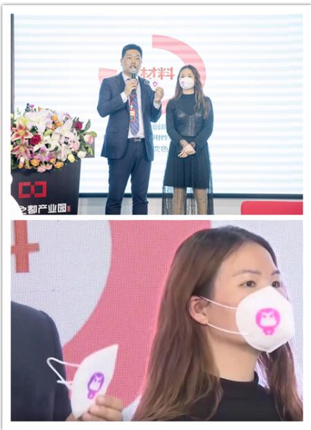 发布会现场演示:口罩上的卡通图案,随佩戴者体温由原本的紫色变成粉色。
