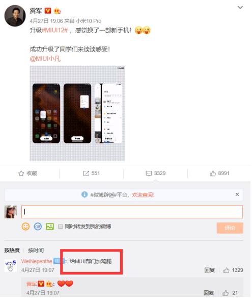 随后,记者在微博上看到,小米创始人董事长兼CEO雷军的个人微博评论下,几乎所有的网友都表示对MIUI12的充分肯定,可见网友对全新MIUI12系统给予了极高的评价。甚至有网友表示,“可以给MIUI部门加鸡腿。”