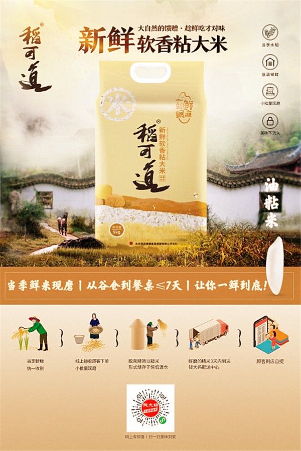 (东方集团张宏伟)目前,人们在饮食上除了对色、香、味的甄别外,更加注重食材的新鲜和安全。为迎合消费者升级的餐桌需求,东方粮油在华南区知名生鲜平台"钱大妈线上商城"(以下简称"钱大妈"),推出了、主打新鲜和现磨概念的定制单品--"稻可道软香粘米",该产品从线上订单获取,到生产加工、配送,整个流程不超过7天,从根本上满足了人们对"鲜味"的探寻。