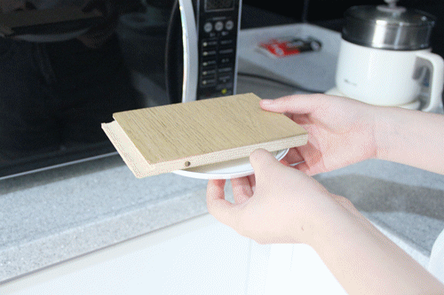 现场准备一微波炉,把地板置入微波炉加热4分钟,看地板是否有开裂膨胀的情况。