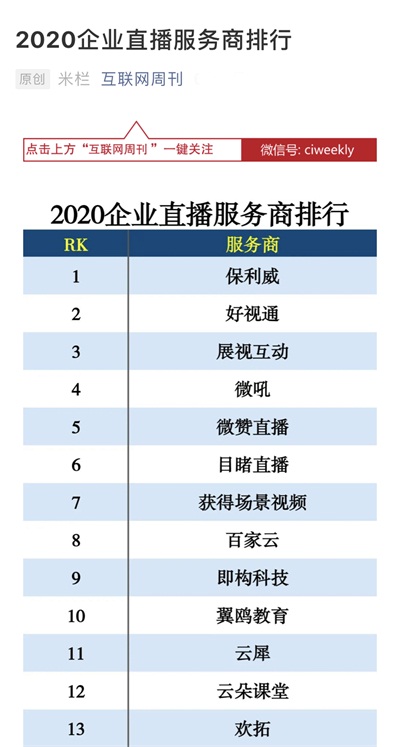 6月9日,由中国科学院主管、科学出版社主办的核心杂志《互联网周刊》,携手eNet研究院联合发布【2020企业直播服务商排行榜】,专注在线教育及企业培训两大领域的云直播技术服务商保利威在众多参选企业中脱颖而出,荣膺榜首。