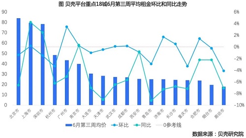 6月第三周,北京市由于疫情反复、全市应急响应级别重新上调、各社区加强人流管控等因素影响,租金水平环比上周有所下降。2020年以来,由于经济和疫情不确定因素,以及城市规划变更、商圈迁移、社区严格管控出入等因素影响,房屋租赁市场出现了显著的变化,特别是个别房屋出现委托价格与租赁价格严重倒挂的趋势,业主租金持续上涨失去动力。