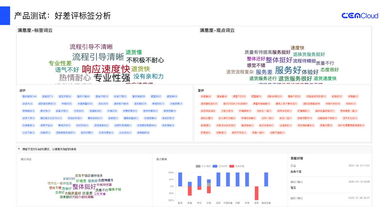 数据采集之后,深入到顾客的情绪状态和推荐意愿的对比,以及产品存在的问题标签云图分析。