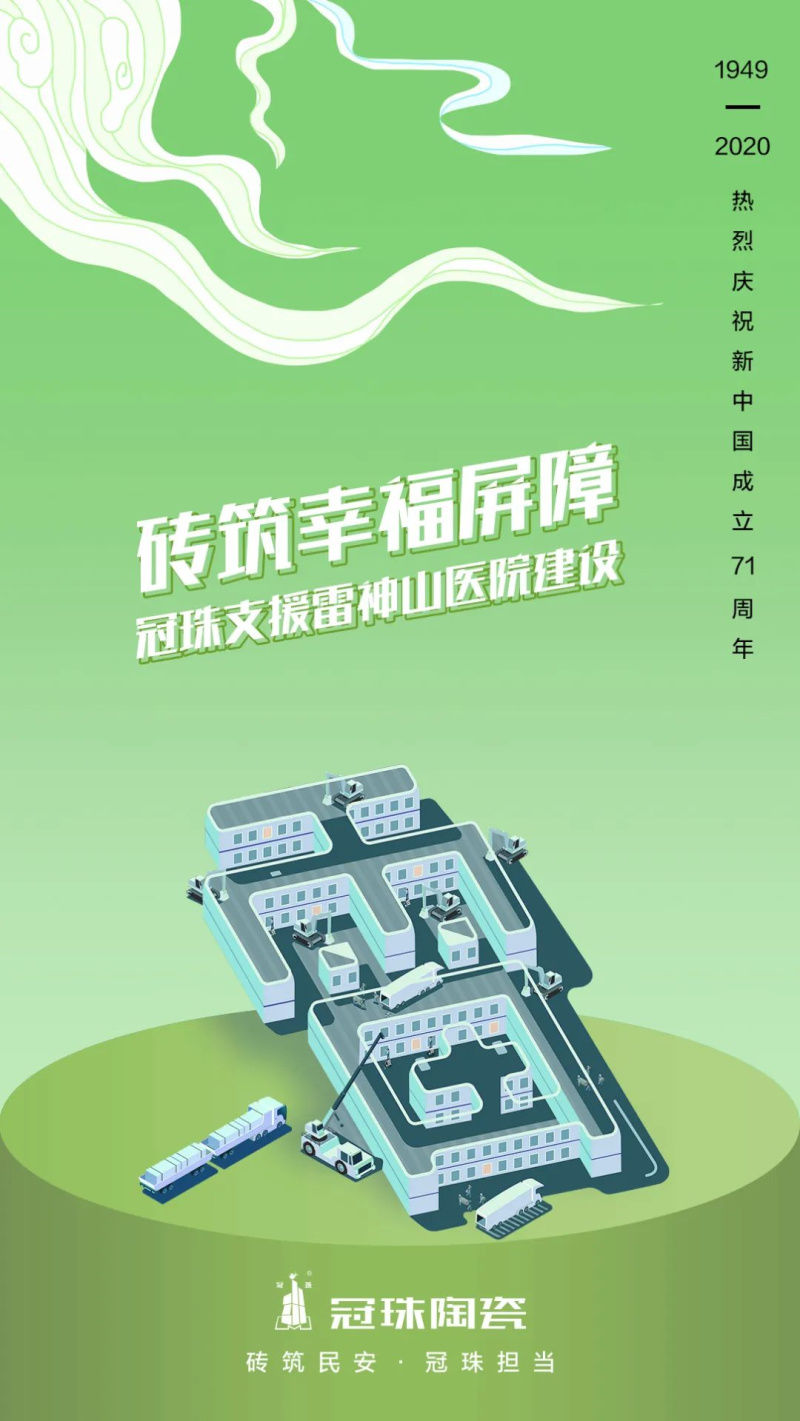 牛津词典里面有一个新词专门为中国而设:Speed Of China,中国速度。这种速度有多魔性?时速350公里的复兴号半日往返千里;首台千万亿次超算“天河一号”,运算1小时相当于13亿人同时计算340年以上;5G开启商用,半秒能下载一部影片……到2020年,为火速支援武汉疫情,10天建成面积75000平米、有1500张病床的雷神山医院,更是刷新了世界对中国速度的理解,而且这种速度,从未止步!在历史的洪流中,在时代的潮流里,冠珠与中国品牌同频,与全民族共呼吸,携手共进,攻克时艰,火速支援武汉雷神山医院建设,砖筑幸福屏障!