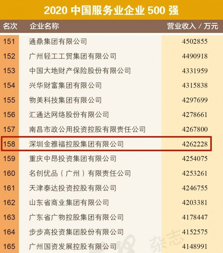 9月27日~28日,2020中国500强企业高峰论坛在河南省郑州市举行,会议发布了“中国企业500强”、“中国制造业企业500强”、“中国服务业企业500强”,以及“中国跨国100大公司”榜单相关数据及分析报告。金雅福集团再度入选“中国企业500强”,排名第429名,较去年提升35名;同时入选“中国服务业企业500强”,排名第158名,较去年提升3名。