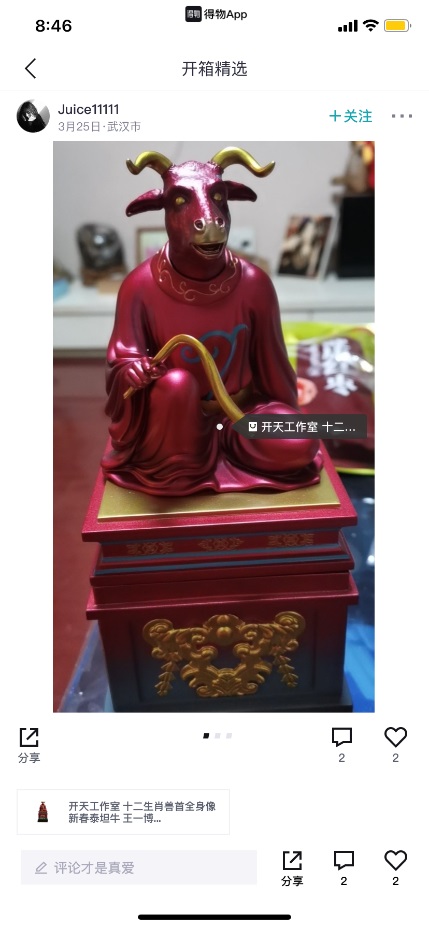 当“潮流”成为年轻人消费的关键词,中国潮玩市场也随之逐渐升温。今年春晚机甲牛机器人的同款潮玩手办“新春泰坦牛” 在得物App,,后,当即售出数百件,受到大批年轻人的喜爱。近日,在得物App社区,首批收到这款手办的用户纷纷晒出开箱视频,并发表图文分享:“太cool了”、“这个真可以!”还有网友表示,收到了红色的牛,希望让自己“鸿运当头”。