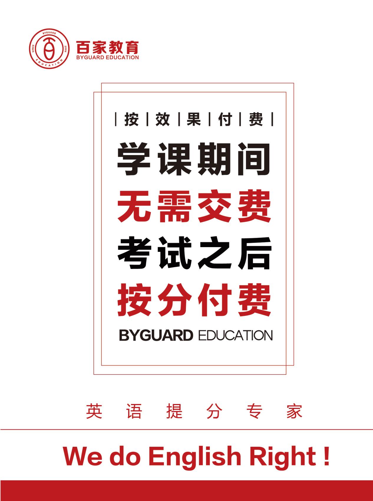 百家一百教育集团专注英语培训16年,主张先提分后付费,按效果付费的后置付费模式领先教培行业,成为众多考生和家长的英语辅导,机构,关于英语提分无论你是初中还是高中,只要你来百家教育报名英语提分课就可享受先提分后付费,学课期间、无需交费,考试之后、按分付费,零元学直至中高考结束。让学生的每一分钟都用在提分上,让家长的每一分钱都花在分数上,就是百家一百家教育集团的教育理念,希望在百家教育的助力下,各位考生都能够取得满意的英语成绩。