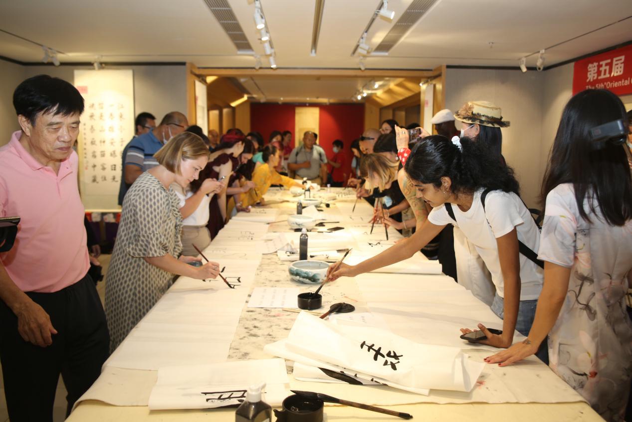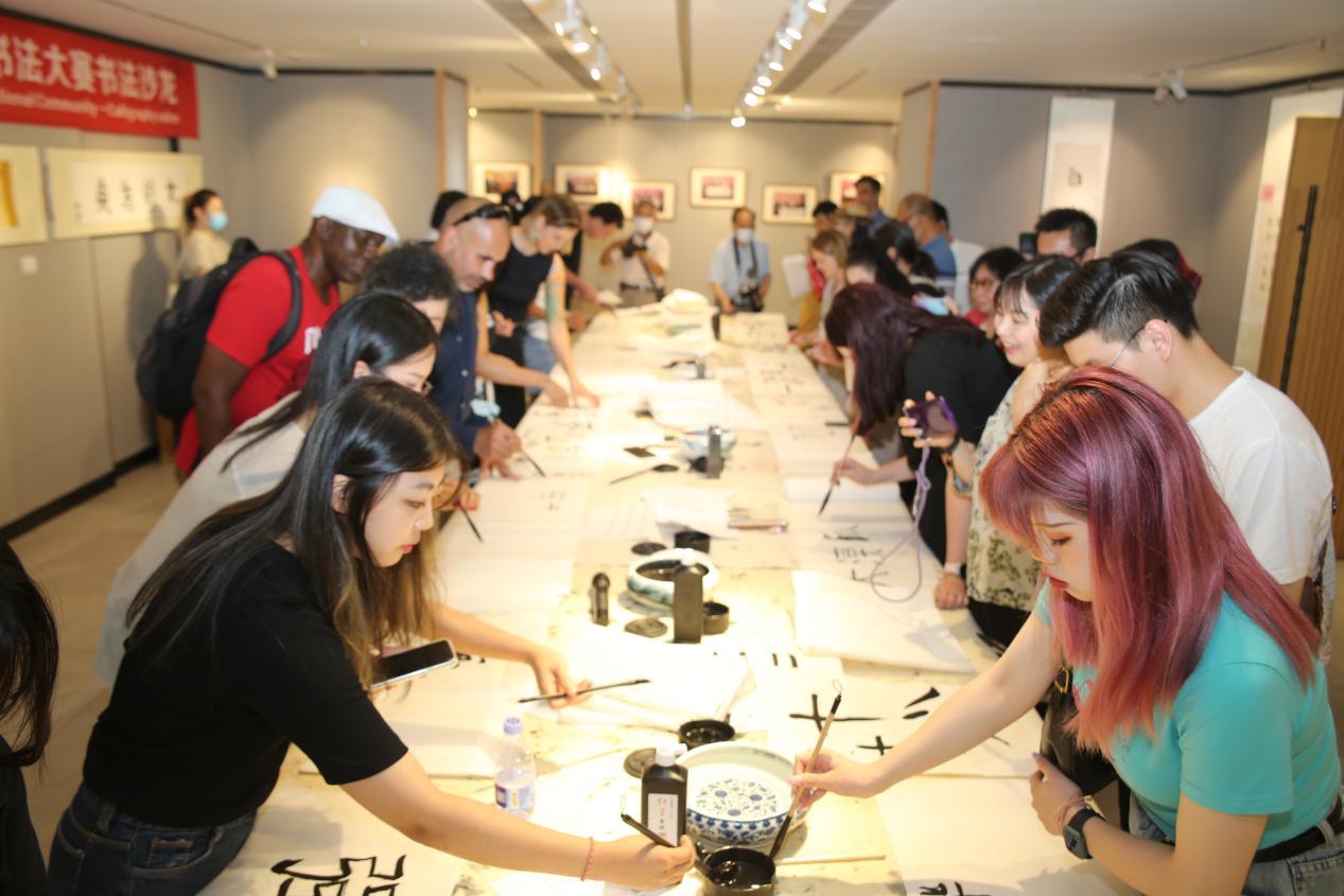 活动现场还设置有书法沙龙环节,超过40名外国友人踊跃参与。他们纷纷提笔,在宣纸上泼墨挥毫,施展自己的书法技艺。他们全神贯注,沉浸在浓厚的书法文化氛围之中。专业书法老师也在一旁悉心指导,将书法专业知识传授。在热烈交流书法心得和浓厚书法文化氛围中,不少外国友人将现场书写的作品提交参赛,更是表达了作品能成功入选优秀作品的期许。