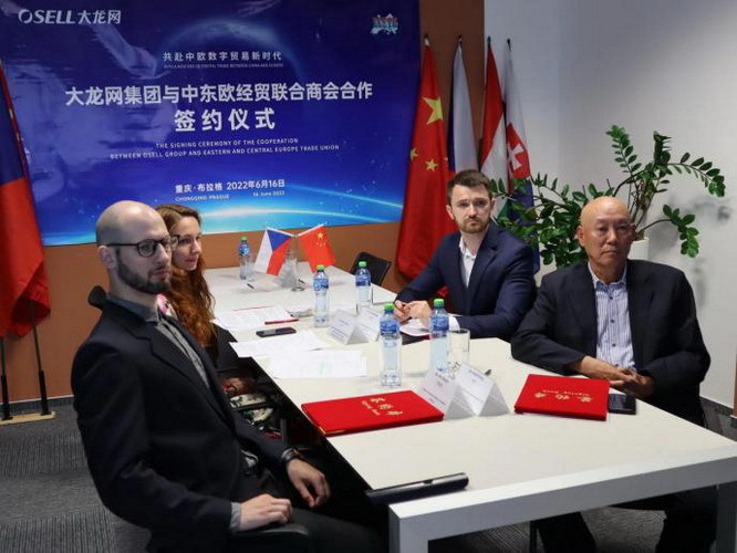 6月16日,大龙网集团与中东欧经贸联合商会、捷克Aecons公司、黄山洁惠环保科技有限公司、安徽尧舜智能袜业有限公司在中国重庆、安徽和捷克布拉格签署跨境电商及中东欧本土化建设系列合作协议。中国国际投资促进会特邀常务副会长姚文萍、重庆市商务委员会一级巡视员熊林、重庆市委网信办信息化协调处处长 廖凯锋、渝中区招商投资促进局局长王永强、渝中区国有资产经营管理有限公司董事长张荣强、渝中区商务委员会副主任陈浩、渝中区委网信办网络管理科科长简明月、中东欧经贸联合商会会长关胜、副会长Mr. Jan Matoušek、匈牙利分会长 Tamas Klesch、大龙网集团董事长冯剑峰等嘉宾出席签约仪式。在数字贸易时代背景下,大龙网集团与中东欧系列合作的签约,不仅加强了重庆与中东欧国家的经贸合作,也加快了中国跨境电商企业在中东欧本土化快速发展。