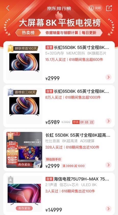 记者从相关平台获悉,今年618大促市场表现较预期稍有差异,但部分品牌任然增幅明显,其中长虹电视实现了量额双增,优于行业大盘。据进一步了解,长虹电视相关负责人表示,长虹8K是618大促8K榜单魁首产品,表现优异,持续领跑市场,稳居行业8K类目销量,;截止18日24点,长虹8K电视的累计销量已超去年全年,京东渠道大屏幕8K平板电视榜长虹真8K电视蝉联榜首180天。