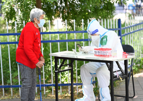 北京链家志愿者为老人检测核酸扫身份证