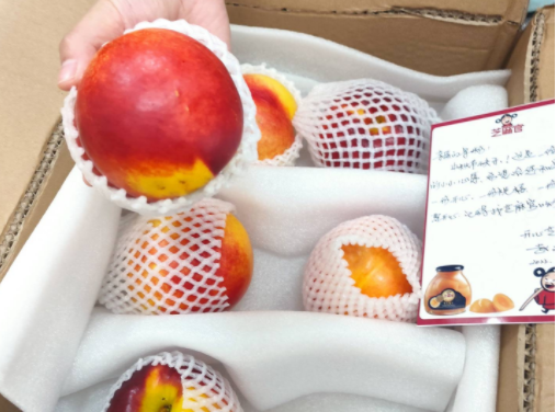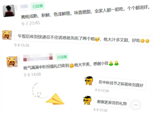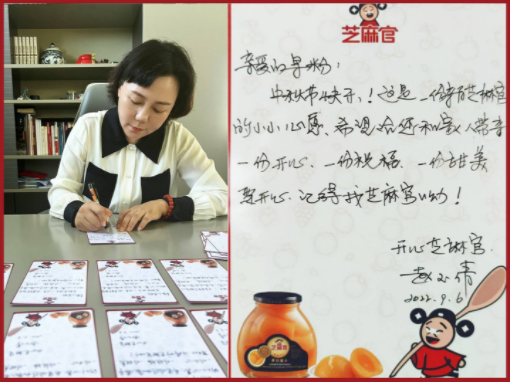 惊喜之一是来源于芝麻官自有果园里的大鲜桃。得天独厚的地理优势加上科学种植,让桃子的个头倍大,口感细腻,甜美多汁。更令人惊喜的是,每箱桃子中都附赠有一张手写贺卡,而落款的赵玉倩女士正是芝麻官食品有限公司的执行董事。当赵总得知要给粉丝邮寄贺卡时,她推开了繁忙的公务,非常坚定地主动要求一份一份地亲笔书写。粉丝收到包裹后惊喜万分,从没想到能够收到芝麻官执行董事的亲笔贺卡,此举无形间加强了芝麻官与粉丝之间的情感连接。