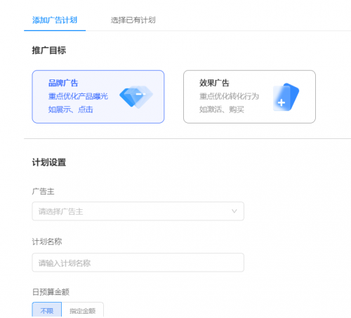 ,可根据自身的投放目的,从推广目标中选择,优化产品曝光的品牌广告,或者,优化转化行为的效果广告,接着设置计划,选择广告主同时输入计划名称。Mediatom的直投广告功能支持制定日预算金额。