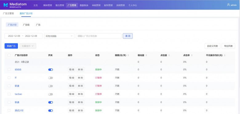 ,在使用Mediatom直投广告功能的时候,需要先对将要投放的直客广告素材进行广告计划、广告组和广告的相关配置。