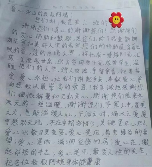 图三:四子王旗第五小学受捐助学生为恒昌公益寄来亲笔感谢信