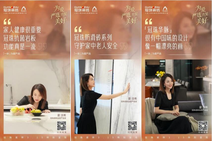 从话题到视频,冠珠精准地通过霍汶希身上的标签,传达冠珠为爱严选的态度,从而深化冠珠瓷砖“美好品质”的315传播IP。