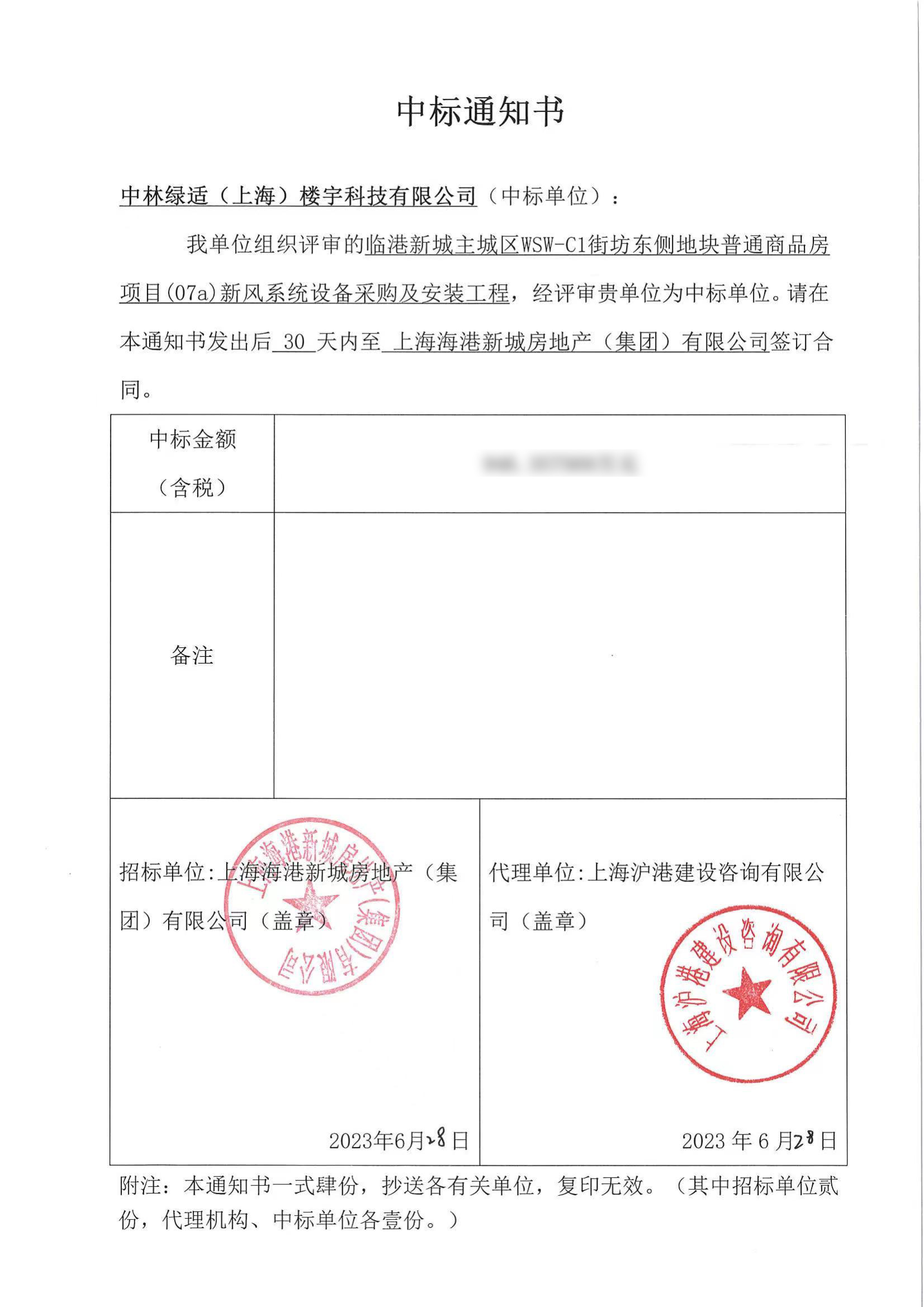 上海沪港建设咨询有限公司受上海海港新城房地产(集团)有限公司委托,就其临港新城主城区 WSW-C1 街坊东侧地块普通商品房项目(07a)新风系统设备采购及安装工程进行公开招标。6月28日,经评审委员会评审综合考量,中林绿适(上海)楼宇科技有限公司凭借雄厚的技术实力及良好的市场信誉,成为该新风系统项目指定服务商。