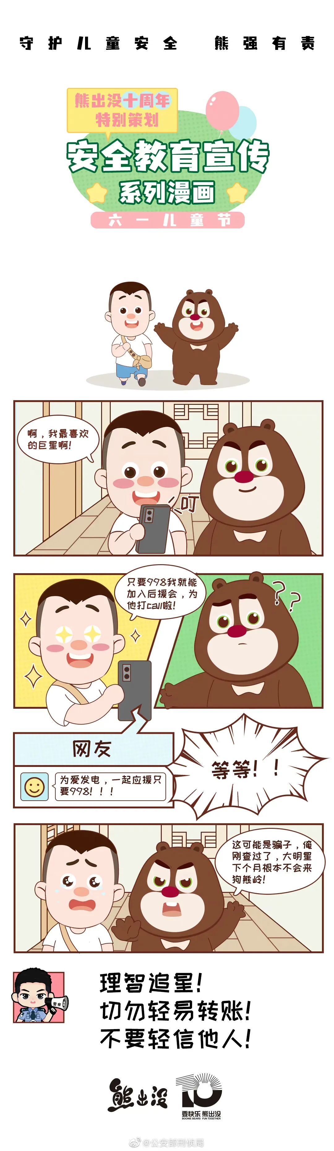 此外,“熊出没”还跨界公益领域,和相关机构共同打造公益内容。例如与公安部刑侦局合作推出了十周年特别策划之安全教育宣传系列漫画,用漫画的形式帮助小朋友们防范和应对网络诈骗、拐卖儿童、校园欺凌等事件。“熊出没”还合作广东消防推出“消防法律知识”动画宣传短片,用动漫的形式帮助小朋友和家人排除居家安全隐患。