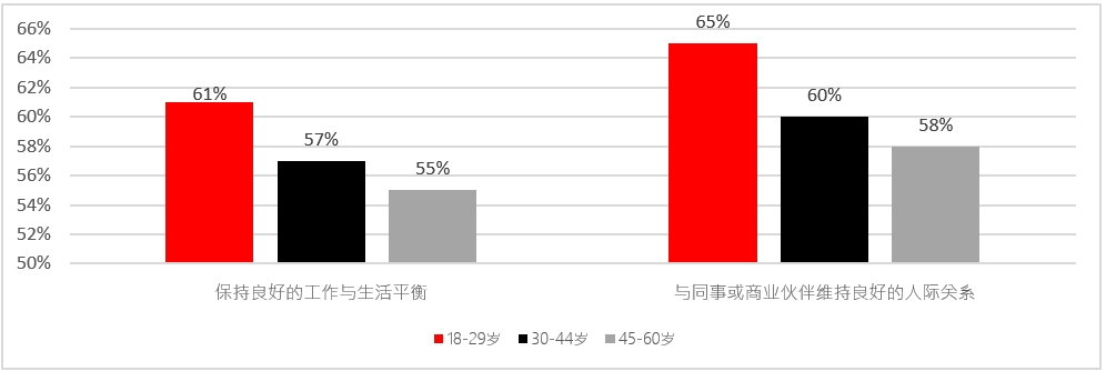 除了在财务规划方面的出色表现,这一代年轻人也在工作和人际关系的管理上也同样表现理想。数据表明,有61%的年轻人能够持续保持工作与生活的良好平衡,同时有65%的年轻人在与同事或商业伙伴的交往中维持着良好的人际关系。