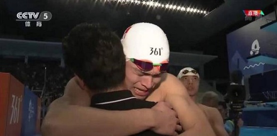 在亚运会男子1500米自由泳决赛上,孙杨夺得本届亚运会个人第四枚,!赛后采访,累惨了的孙杨抱着记者哭泣不止:“今天真的靠意志在顶,旁边的那个选手逼得特别凶,特别是后面,我完全是咬牙在坚持!”
