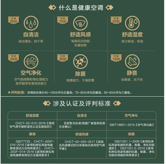 与此同时,苏宁已联合中国家用电器研究院,共同发布了国内第一份具有行业代表性的健康空调标准。针对市场上所有空调产品,从“智能风向风量”、“独立除湿保湿”、“空气细微颗粒物处理”、除甲醛等有害物质”、“自清洁”、“低噪”、“除菌干燥防霉”多个功能维度开展健康空调评级,,五星,为消费者挑选健康空调提供权威指导。