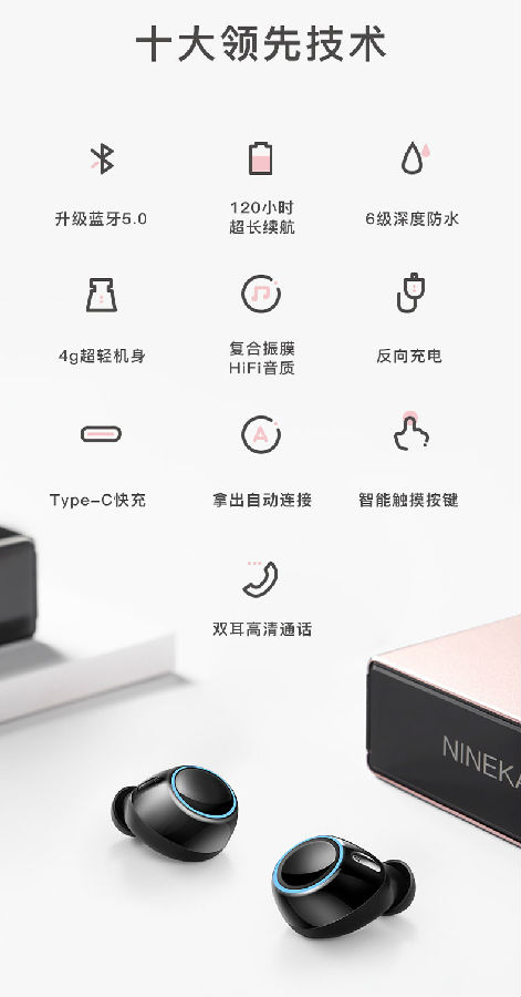 NINEKA南卡N2蓝牙耳机之所以这么受欢迎,主要是性价比特别高,NineKa南卡蓝牙耳机的配置、音质以及续航能力在蓝牙耳机中是数一数二的。这款主打高性价比的蓝牙耳机采用全新蓝牙5.0芯片,6级深度防水,采用创新高分子复合振膜,支持type-c快充,支持智能触控等十大蓝牙,技术。