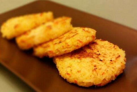准备好自己喜欢的食材,切成小粒,加入少许盐腌制,油锅姜片爆香,入基本材料炒香盛出备用,另起油锅,倒入金龙鱼大米煮好的米饭炒匀,加入盐和少许糖调味,然后倒入翻炒之后的备用材料炒匀,等炒好的金龙鱼大米饭放凉之后,做成米饼的形状,入加了油的平底锅小火煎,煎至两面金黄即可。