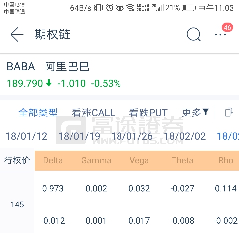 2.【特色】期权新增希腊值及其他衍生字段;在期权页面,向右滑动,可以看到Delta以及其他衍生字段信息