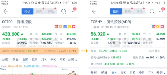 另外,以腾讯控股为例,在港股个股页,也可看到“腾讯控股ADR”股票的报价信息(已换算为港元价),以及和腾讯控股港股的价差和价差百分比。