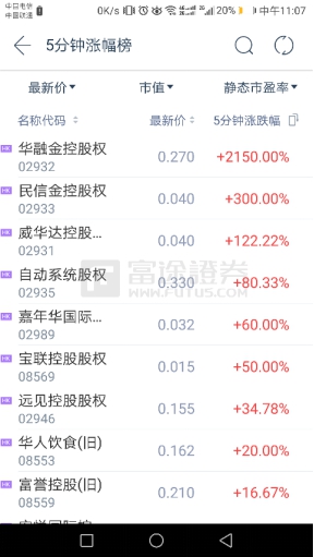 以港股为例,入口在【行情-市场-港股】三大指数下方,点击进入可查看5分钟涨跌幅榜,向右滑动可查看5日、10日等涨跌幅榜。