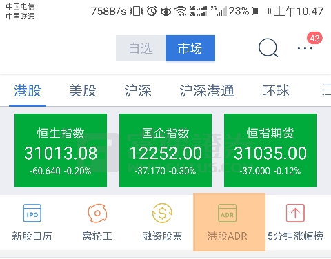 在【行情-市场-港股】三大指数下方增加入口【港股ADR】,点击进入“港股ADR排行榜”页面,可以查看在香港上市的股票对应的在美股上市的ADR股票排行榜